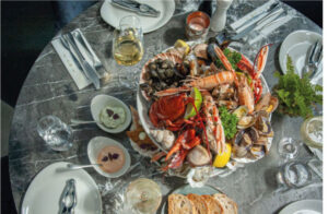 Kippenvleugels bereid met Parmezaanse kaas en look als aanloop naar perfect gegaarde rib-eye en wagyu uit Kobe met frietjes van ongeschilde aardappelen. IJs van kokosmelk met boven de gril gegaarde ananas en karamel-honingsaus met Jack Daniel’s.